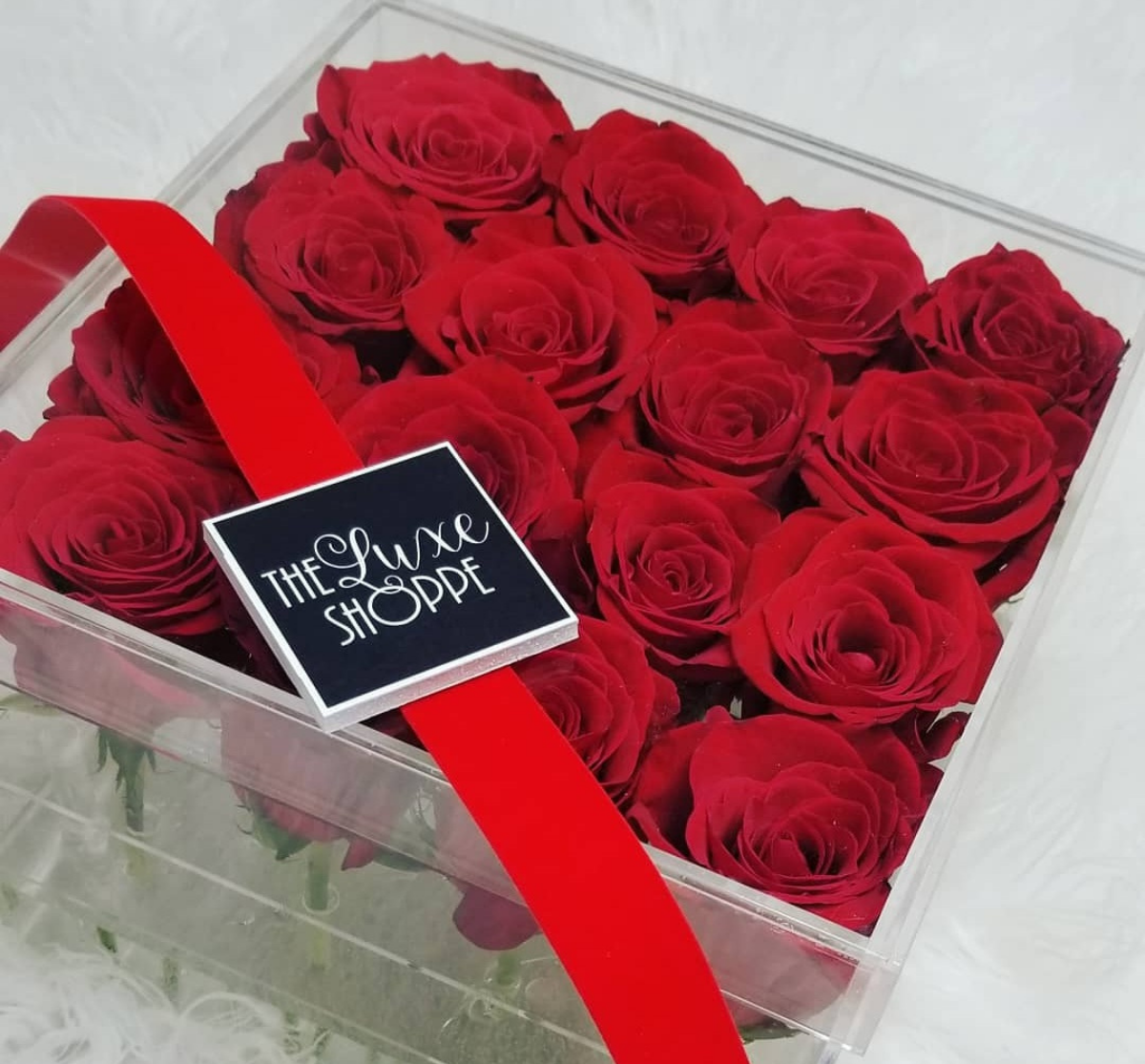Modern acrylic keepsake box with lid with 9 or 16 neatly placed Red, Pink or White Roses