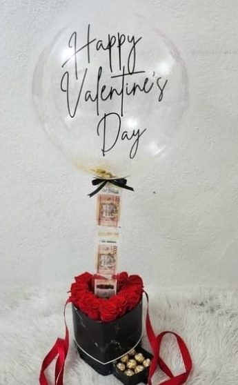 When the ribbon is untied, a helium-filled balloon rises, lifting the money into the air